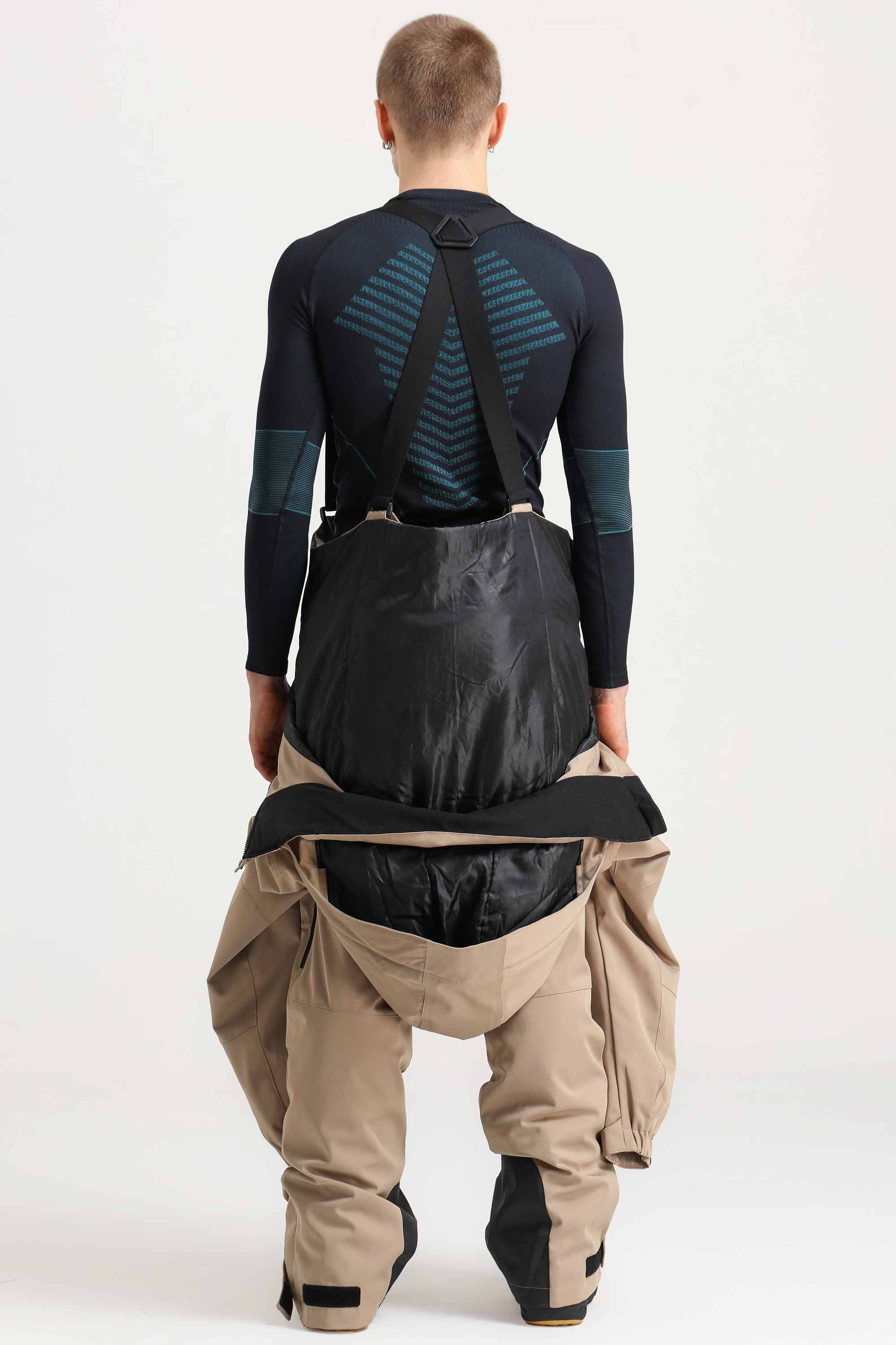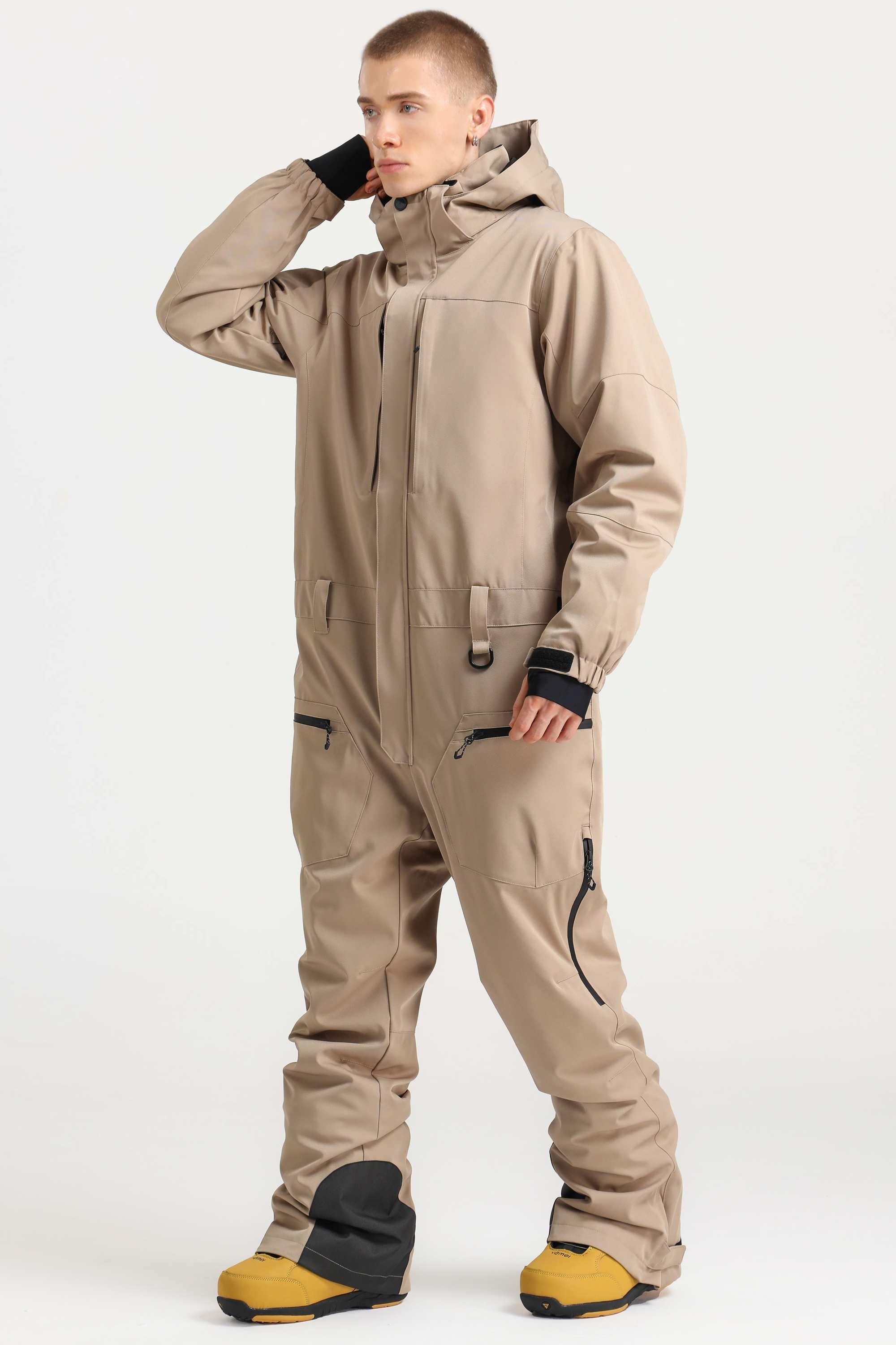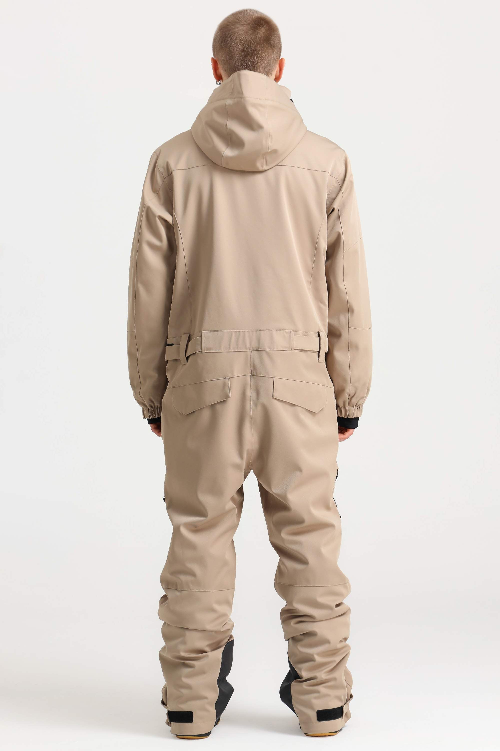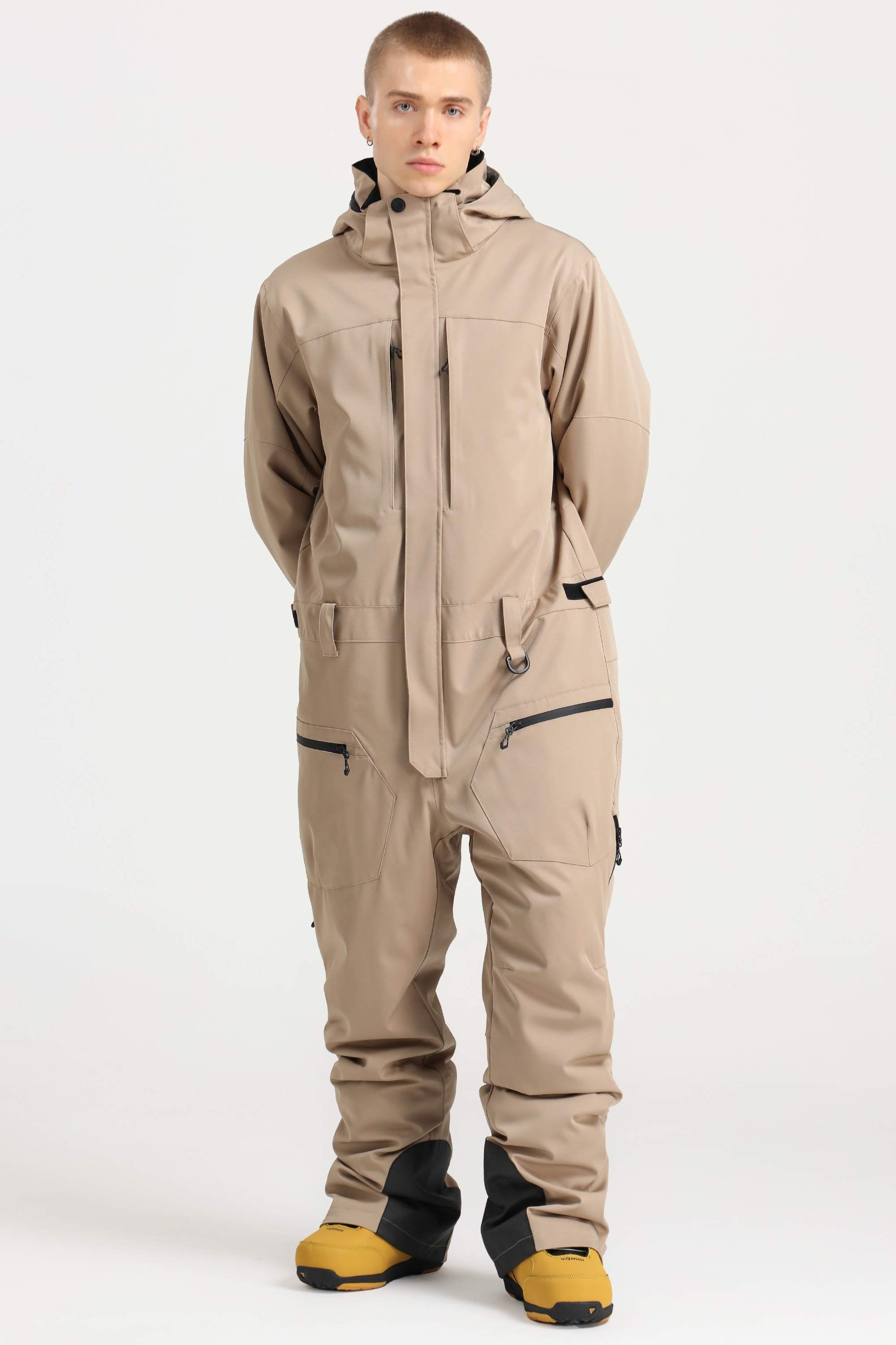 Men's Khaki Stylish Waterproof & Windproof Loose-Fit One-Piece Ski Suit with Detachable Hood & Multipockets