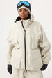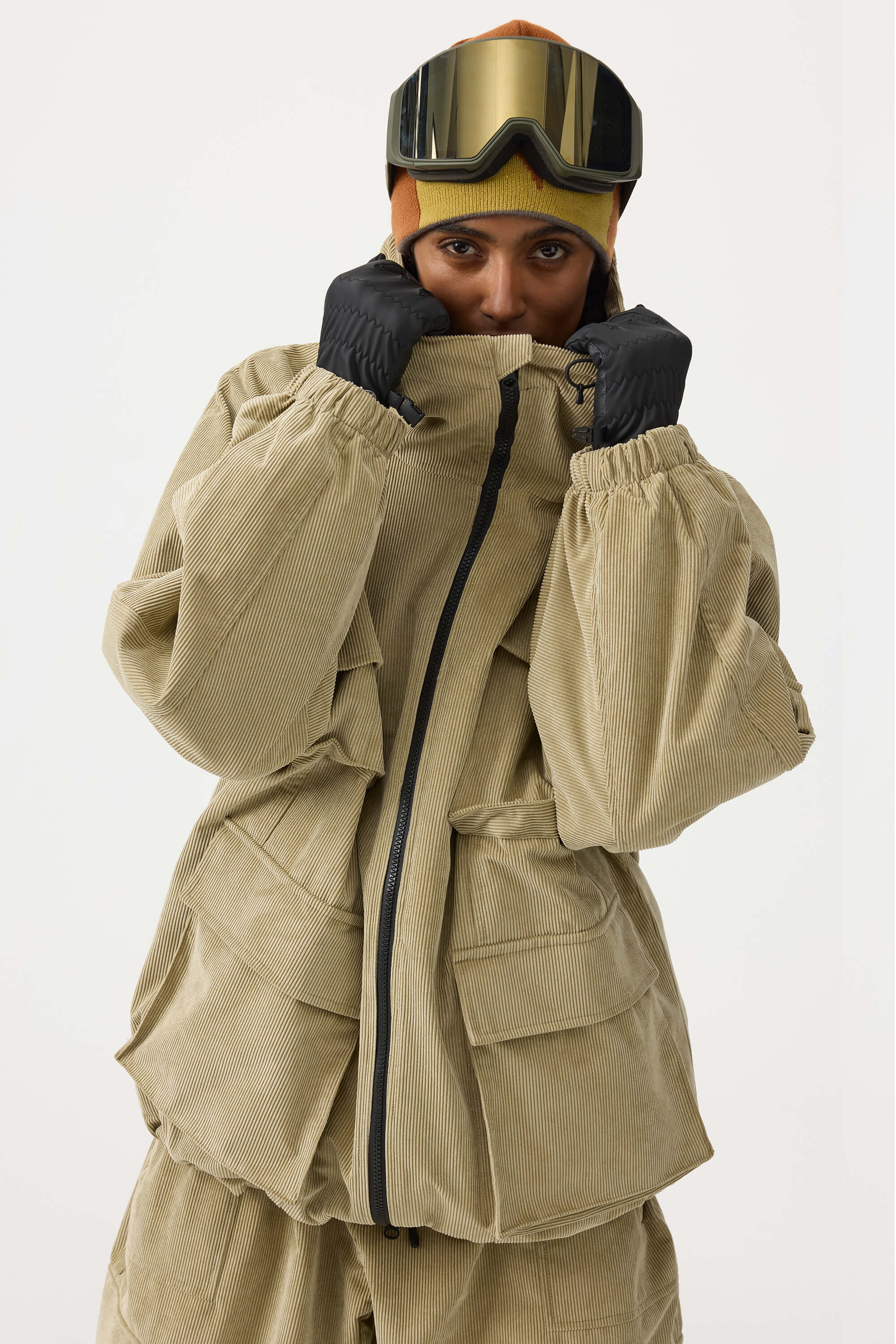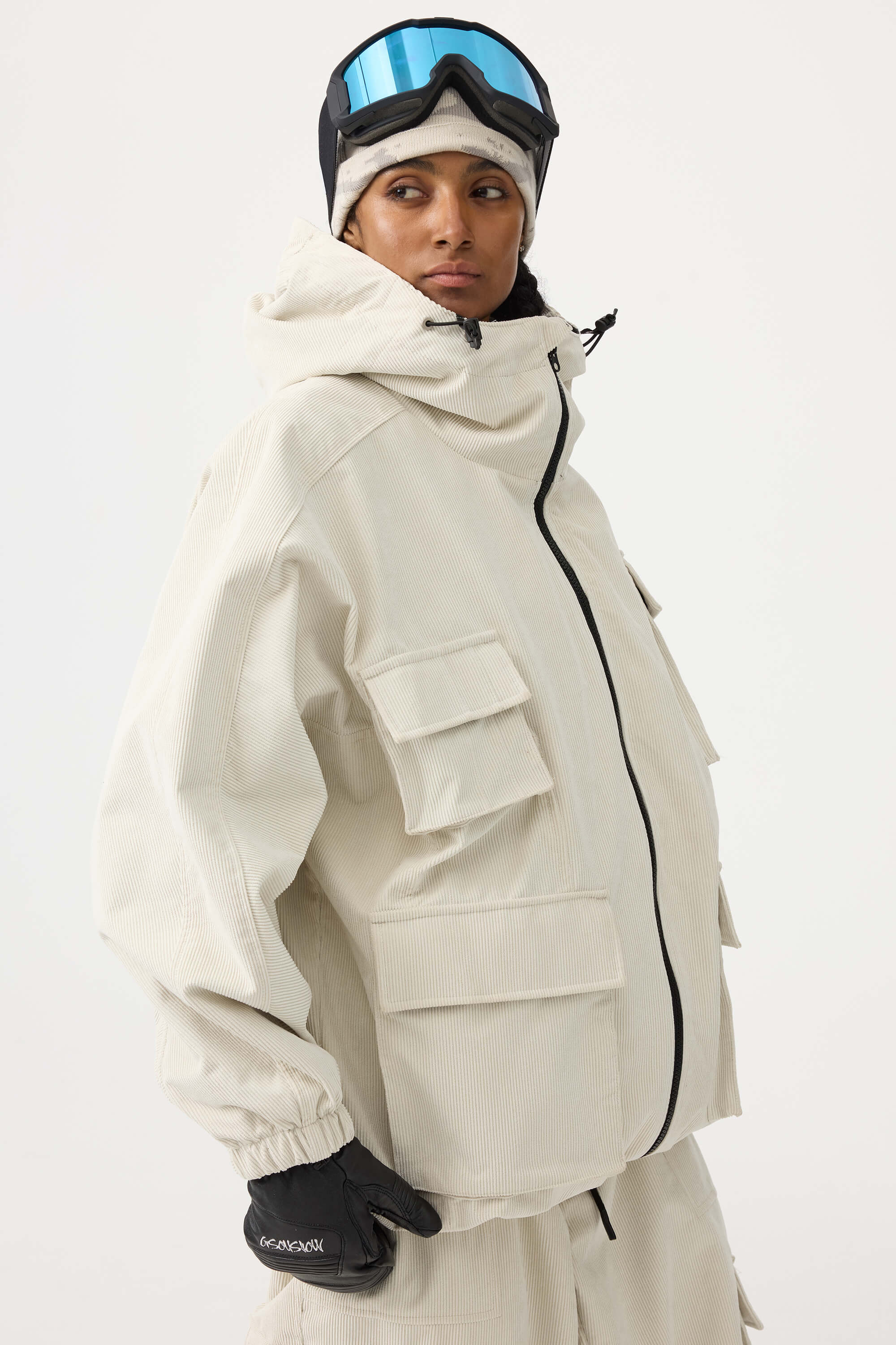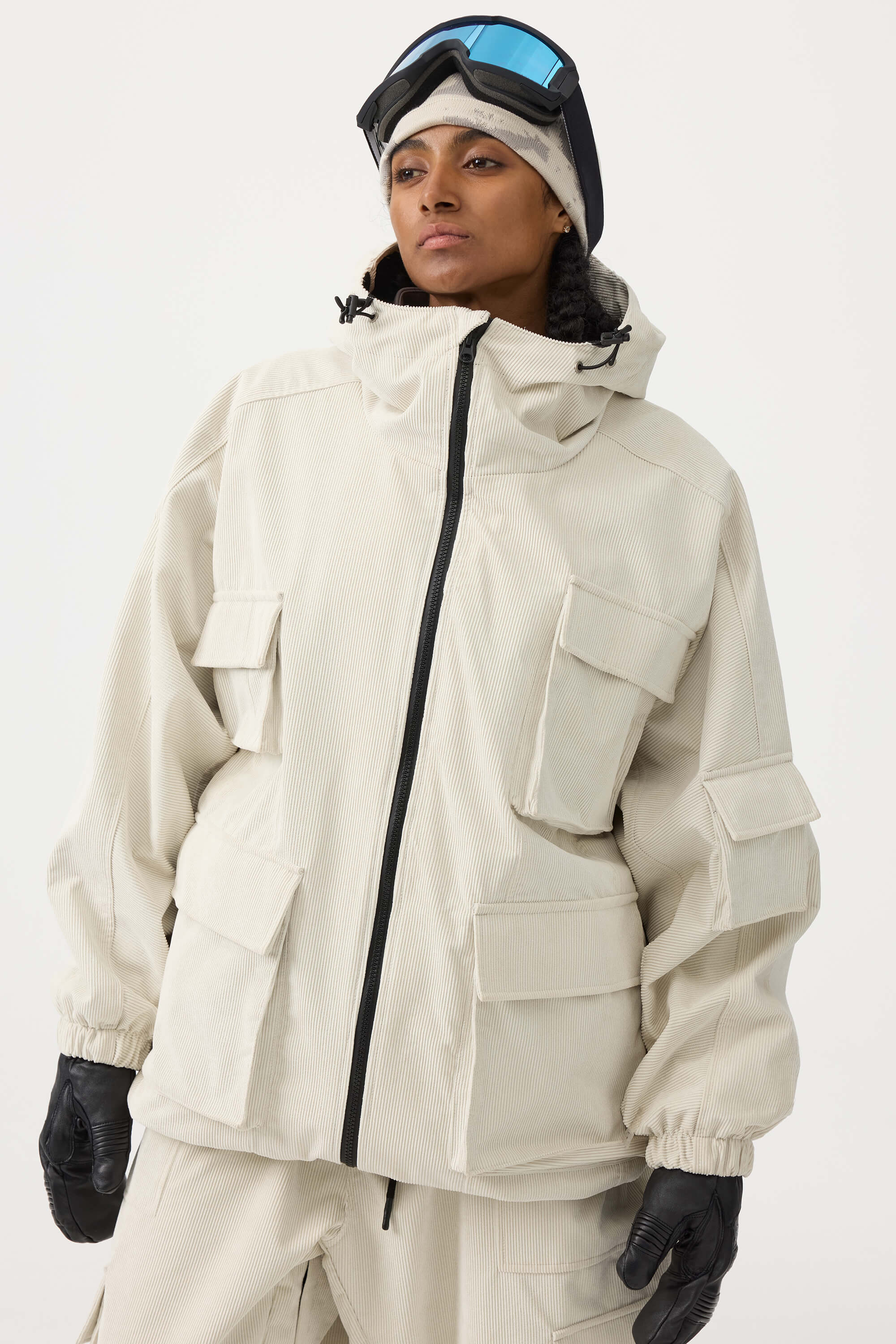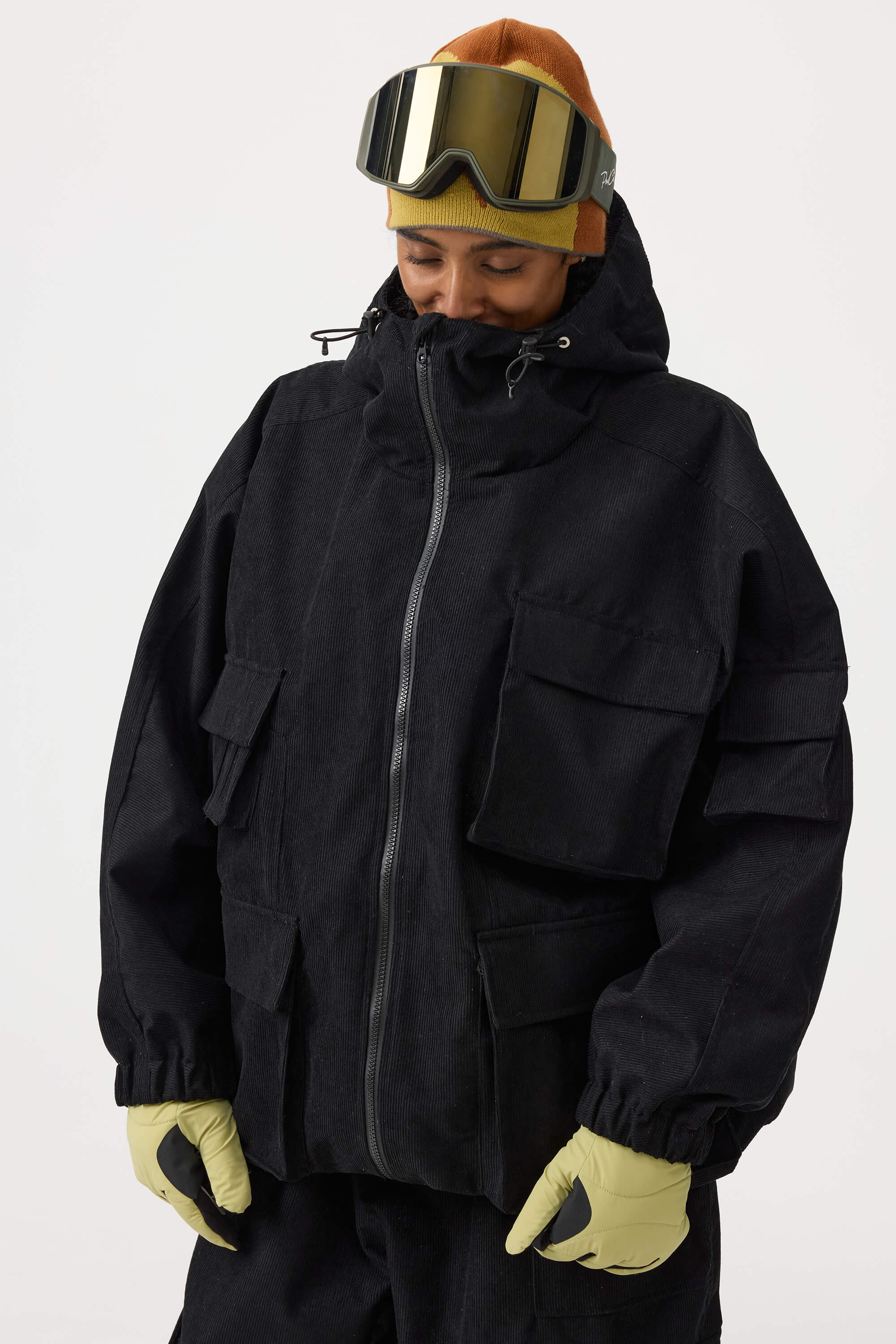 Chaqueta de nieve de pana negra impermeable con mangas de murciélago y bolsillo grande para mujer