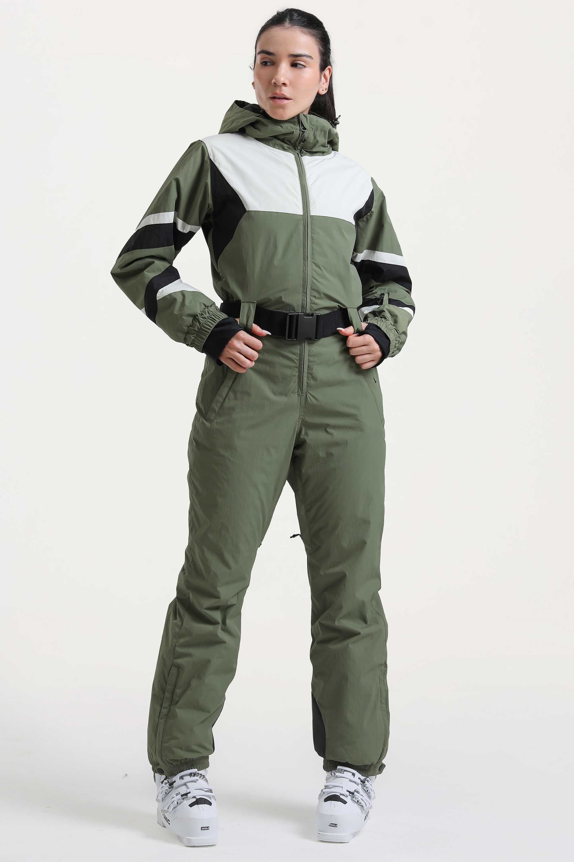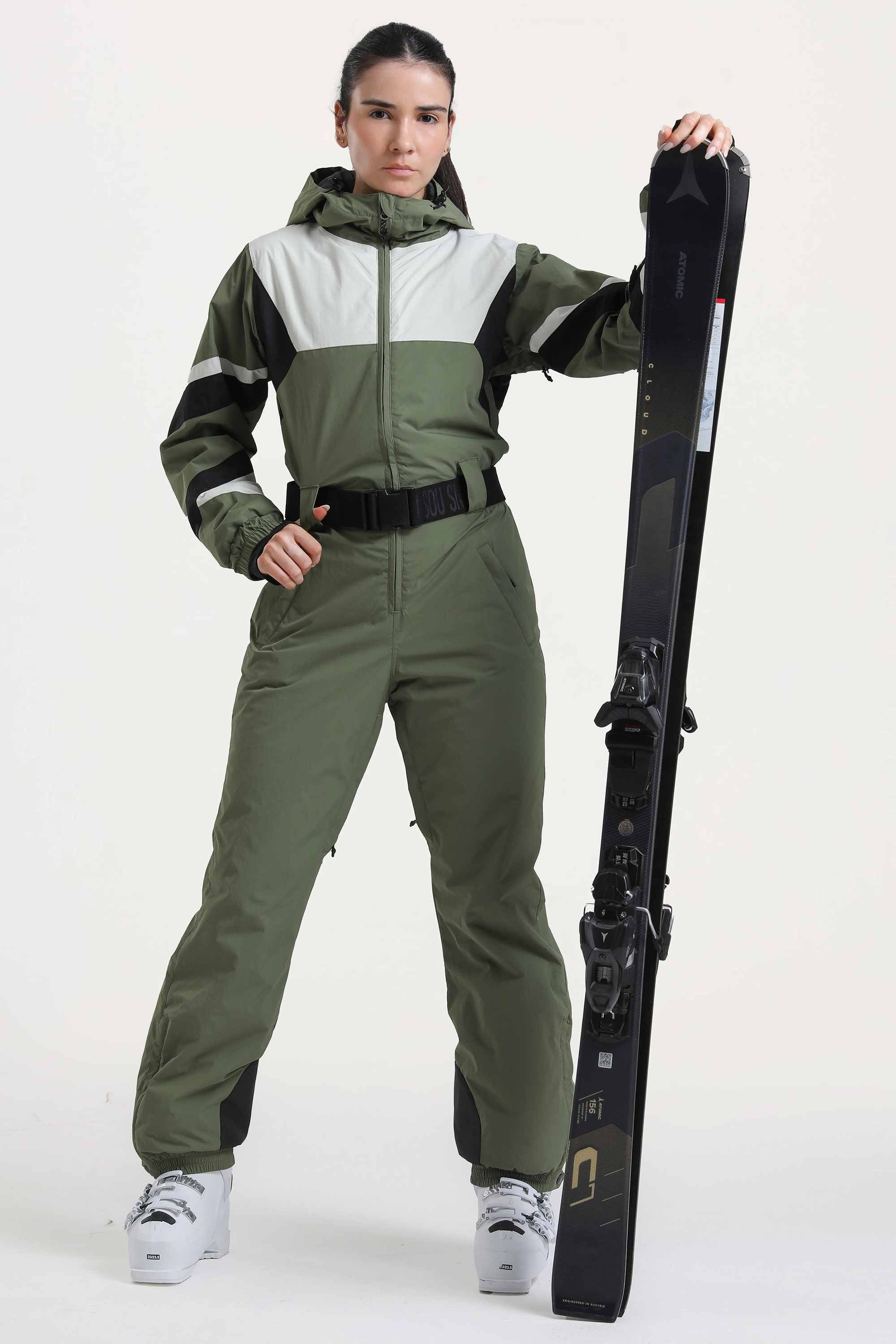 Women's Army Green Insulated Color-Block Utility One-Piece Ski Suit with Durable Fabric & Multiple Pockets